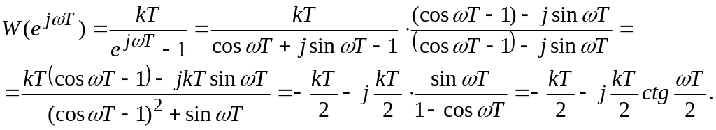 При вычислении АФХ по ЗФП W(z) разомкнутой САУ математическое описание АФХ представляется трансцендентной периодической функцией с периодом 2π/T, неудобной для расчетов. Например, если разомкнутая САУ состоит из импульсного элемента, экстраполятора нулевого порядка и интегрирующего ОУ, то её ЗФП будет иметь вид: