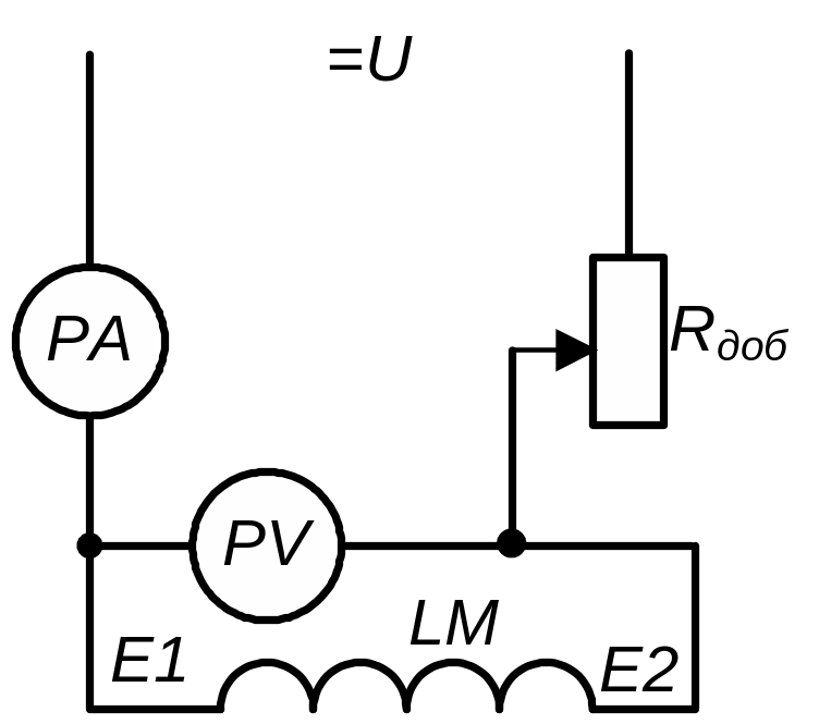 Источник питания постоянного тока, по возможности, выбирается пониженного напряжения. Резистор Rдоб выбирается по величинам тока и мощности, не превышающим его паспортных данных. Пределы измерений приборов выбираются с учетом ожидаемых величин напряжения источника питания и тока, протекающего по исследуемой цепи. При измерении сопротивления якорной цепи электродвигателя ток не должен превышать 10 % - 15 % номинальной величины Iн, а обмотка возбуждения должна быть зашунтирована накоротко во избежание в ней индуктированного напряжения в момент включения и отключения источника питания. Здесь имеется в виду следующее, что в переходном режиме при включении или отключении источника питания ротор машины постоянного тока может начать вращаться из-за взаимодействия магнитных потоков остаточного магнетизма сердечника обмотки возбуждения и потока обмотки ротора, возбуждаемого током якорной цепи, если его величина близка к Iн.