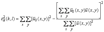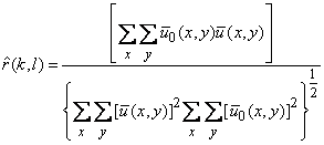 Поиск по образцу в данном методе сводится к вычислению нормированной взаимной корреляции распределения яркости (двумерного сигнала) на текущем фрагменте первого снимка с распределениями яркостей фрагментов, лежащих в некоторой предполагаемой окрестности образа этого фрагмента на аффинно-преобразованном втором снимке и определению целочисленных параметров взаимного смещения исходного фрагмента и его образа, устанавливаемого по экстремуму корреляционного функционала.