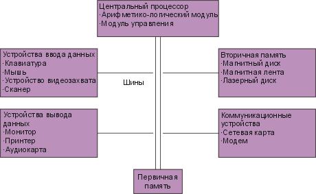 Центральный процессор преобразует поток данных в удобную для обработки форму, а также управляет другими компонентами компьютерной системы. Первичное хранилище данных временно хранит инструкции программы и данные во время обработки. Вторичное устройство хранения данных (магнитный или лазерный диск, магнитная лента) хранит данные и программы, которые не участвуют в обработке в данный момент. Устройства ввода, такие как клавиатура и мышь, преобразуют данные и команды в электронную форму, понятную компьютеру. Устройства вывода, такие как принтер и монитор, преобразуют электронные данные, представленные компьютером, и отображают их в той форме, в какой их могут понять люди. Коммуникационные устройства обеспечивают соединения между компьютерами и компьютерными сетями. Шина (bus) – это устройство для передачи данных и сигналов между различными частями компьютерной системы.