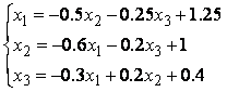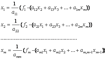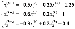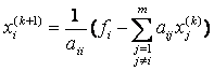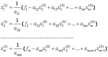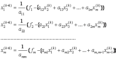 Предположим, что диагональные элементы матриц A исходной системы не равны 0 (aii ≠ 0, i = 1, 2, …, n). Разрешим первое уравнение системы относительно x1, второе относительно x2 и т.д. Получим следующую эквивалентную систему, записанную в скалярном виде: