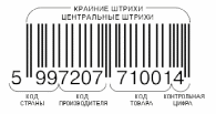 UPC (Universal Product Code). Существует в нескольких версиях. Наиболее распространенным является код UPC версии А (UPCA). Это 12-разрядная маркировка, состоящая из 10 основных цифр и двух вспомогательных. Первая цифра – вспомогательная и обозначает тип продукта. Следующие пять цифр – код производителя. После двойной разделительной полосы идет другая группа из пяти цифр, несущая информацию о самом продукте. И наконец, последняя цифра - контрольная, и предназначена она исключительно для сканера и компьютера, чтобы определить корректность считывания всего кода.
