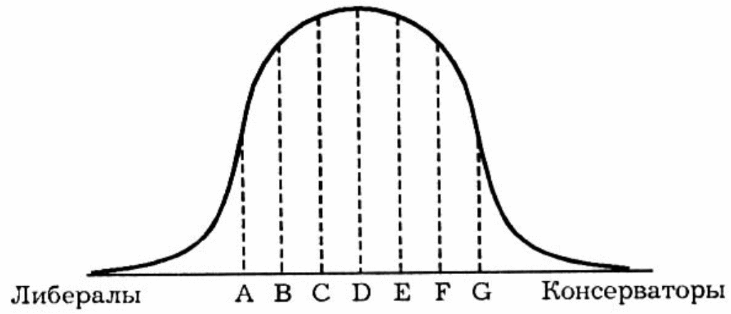 263. На рисунке показано распределение симпатий избирателей по вопросу о темпах реформирования экономики. Идет политическая борьба между тремя партиями: А — левые радикалы, В — центристы, С — правые радикалы.