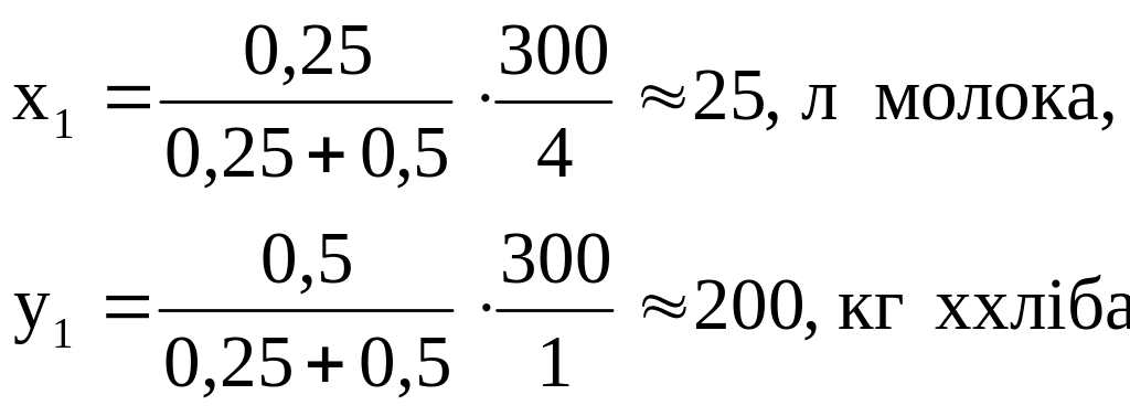 2. Знайдемо скільки хліба (у1) і молока (х1) купує пенсіонер після підвищення пенсії і за нового співвідношення цін на ці харчові продукти: