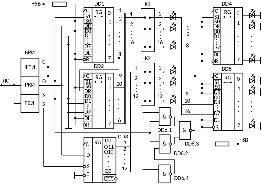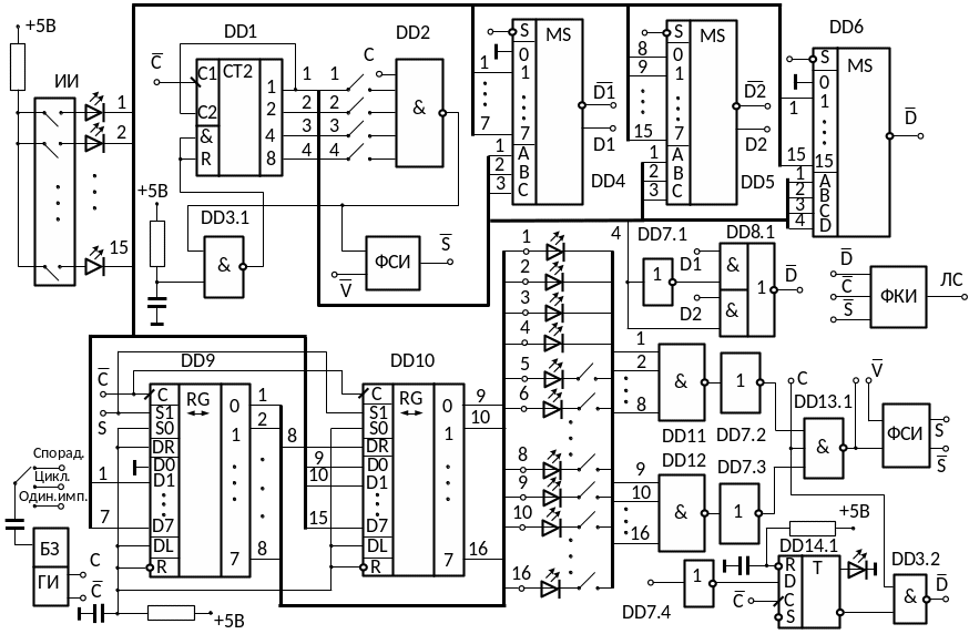 Для контроля набираемой тумблерами кодовой комбинации, а также состояний выходов регистров и D-триггера при пошаговом проходе цикла передачи в режиме одиночных импульсов блока БЗ и ГИ в соответствующие цепи схемы включены светоизлучающие диоды. Следует подчеркнуть, что загрузка в триггер DD14 данных, поступающих на вход D, происходит по положительному перепаду тактового импульса, поступающего на вход С, по которому происходит также сдвиг данных в регистрах DD9, DD10. Поэтому для четкого переключения триггера на его C вход необходимо подавать импульсы тактовой частоты, задержанные на время переключения регистров сдвига.