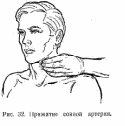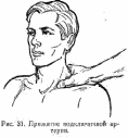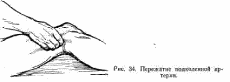 Прижатие кровеносного сосуда. При венозном и капиллярном кровотечении обычной давящей повязки вполне достаточно для остановки кровотечения. При артериальном кровотечении прибегают к прижатию сосуда на протяжении одним или двумя пальцами, иногда кулаком: а) прижатие подключичной артерии производят за счет сдавления тканей во внутренней трети позади ключицы (рис. 31); б) прижатие сонной артерии производят на шее в средней трети по переднему краю кивательной мышцы (рис. 32); в) прижатие бедренной артерии производят путем сдавления тканей во внутренней трети пахового сгиба (рис. 33); г) прижатие подколенной артерии производят путем сдавления тканей в подколенной ямке при полусогнутом коленном суставе (рис. 34).