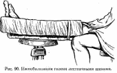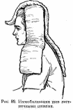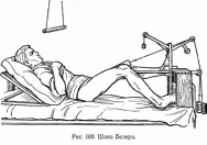 Различают следующие виды вытяжения. При переломах костей верхних конечностей применяют вытяжение эластической тягой при помощи резиновой трубки, нижних конечностей— при помощи груза. При переломах позвоночника больного кладут на щит, помещенный на кровать. Головной конец кровати приподнимают, верхнюю часть туловища фиксируют при помощи специальных ватно-марлевых колец или петли Глиссона к спинке кровати — вытяжение тяжестью собственного т е л а.