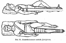 При переломах нижних конечностей: аутоиммобилизация, шина Дитерихса, подручные средства.