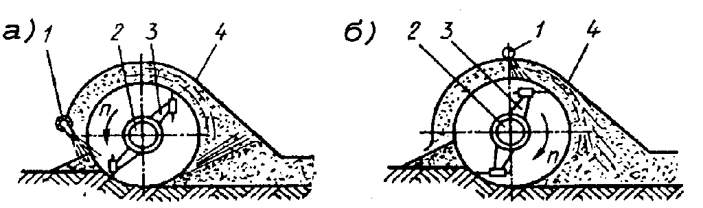Вращаясь, лопатки ротора захватывают грунт и отбрасывают его к стенке ограждающего кожуха фрезы. Комочки грунта, ударяясь о крышку кожуха, размельчаются. Одновременно кромка крышки кожуха выравнивает и несколько уплотняет поверхность разрыхленного грунта.