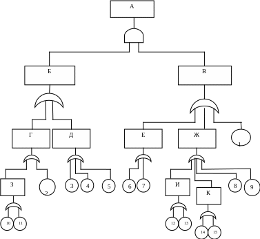 Условные обозначения: А – пожар; Б – источник возгорания; В – горючее вещество; Г – возникновение искры; Д – открытый огонь; Е – розлив легко воспламеняющихся жидклстей; Ж – утечка горючих газов; З – короткое замыкание; И – разгерметизация емкостей с газом; К – нарушение работы вентиляционной системы.