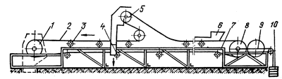 Рис. Ленточный конвейер: 1 - приводной барабан; 2 - рабочая ветвь ленты; 3 - желобчатая роликовая опора; 4 - прямая роликовая опора; 5 - разгрузочная тележка; 6 - загрузочное устройство; 7 - станина; 8 — натяжной барабан; 9 — стальной трос; 10 — груз.