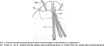 Колючо-сисний ротовий апарат (рис. 4) мають клопи, попелиці, складається він із верхньої губи, приєднаної до голови; хоботка, утвореного членистою, позбавленою щупиків нижньою губою, в якій лежать у поздовжньому жолобку чотири колючі тонкі й довгі, дуже видозмінені щетинки - верхні та нижні щелепи. При живленні хоботок упирається в субстрат, коліноподібно вигинається назад, і перша пара щетинок (верхні щелепи) проколює покриви і проникає у тканину рослин. Друга пара щетинок (нижні щелепи) на внутрішньому боці має по два поздовжніх канальці (жолобки), і при щільному зіткненні обох щетинок утворюються два внутрішні канали. Потім по одному з них у тканину рослини вводиться слина з протеолітичними ферментами для розчинення поживних речовин, а по другому - всмоктується їжа.