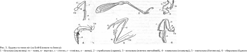 копальні - передні ноги з укороченими і розширеними стегном і гомілкою та недорозвиненою лапкою (вовчок звичайний, травневий хрущ, жук-гнойовик);