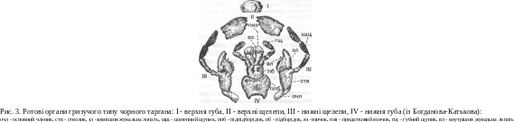 складається із чотирьох відділів: 1) верхньої губи у вигляді непарної поперечної пластинки (плоскої складки шкіри), що прикриває ротові органи зверху, рухається лише зверху вниз; 2) парних і нечленистих верхніх щелеп, що відкушують і подрібнюють тверді частинки їжі, рухаються лише в одній горизонтальній площині; 3) парних і членистих нижніх щелеп, що складаються із основного членика, який приєднується до голови, короткого стволика, з'єднаних з ним двох жувальних лопатей (зовнішньої й внутрішньої) і рухливого щелепного щупика; 4) членистої нижньої губи, яка розчленована на підборіддя, що прикріплюється до голови і приєднане до нього підборіддя, на якому розміщені дві пари жувальних лопатей, які часто називають язичками, і пари членистих і губних щупиків.