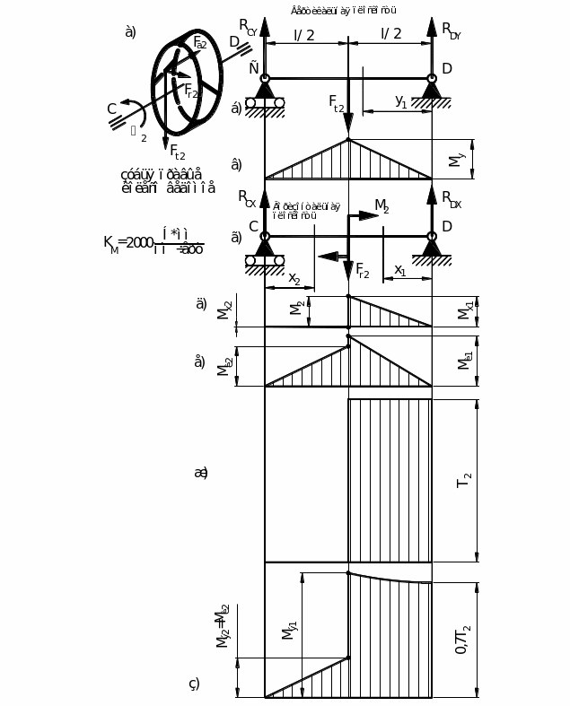 2. Схема нагружения вала в горизонтальной плоскости показана на рис.6,г. Осевая сила Fa2, действующая в горизонтальной плоскости, заменяется сосредоточенным моментом