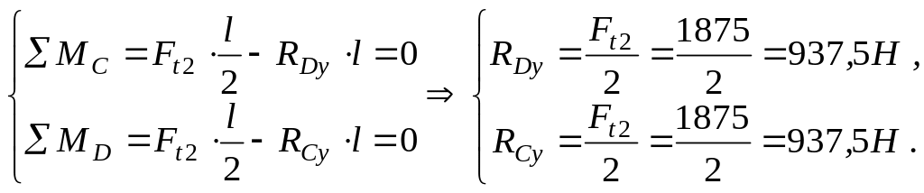 Вертикальные составляющие реакций в опорах RDy и RCy определяются из уравнений моментов относительно опор C и D: