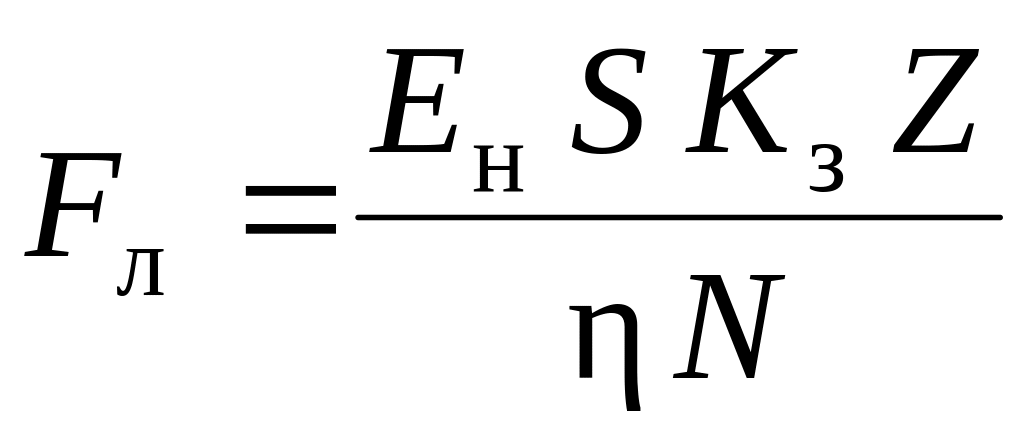 где Ен – минимальная нормируемая освещённость (табл. 2.1), лк; Kз – коэффициент запаса, учитывающий снижение эксплуатационных характеристик ламп (табл. 2.2); Z – коэффициент неравномерности освещения поверхностей, расположенных между светильниками (принимают 1,15 – 1,3); η – коэффициент использования светового потока в зависимости от коэффициентов отражения светового потока от стен и потолка и индекса помещения (табл. 2.3).