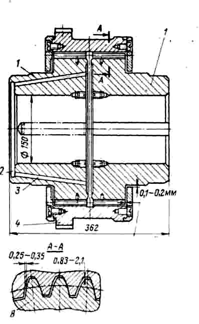 Зубчаста муфта (рисунок 2.4.4.) складається з двох навпіл муфт 1, які насаджені на кінці валів з натягом. Навпіл муфти на периферичній поверхні мають зубці евольвентної форми. Обидві навпіл муфти охвачуються коронкою (обоймою) 4. передача крутного моменту від однієї навпіл муфти до іншої здійснюється через зубчасте зачіплювання, яке може надійно працювати лише в масляній ванні. Масло подається з сусіднього з муфтою підшипника до кільцевих масло збірників 2, звідки під дією відцентрованих сил по каналах 3 надходить на зубці.