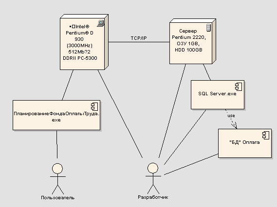 Процесс развертывания начинается с установки СУБД MS SQL Server 2005/2008 на сервер, расположенный на предприятии. Затем необходимо подключить спроектированную базу данных «Оплата». На каждую машину, являющуюся клиентом, с помощью back up файла устанавливаем разработанное клиентское приложение «Планирование фонда оплаты труда».