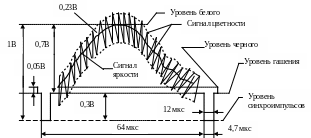 На рис. 3 приведен фрагмент осциллограммы одной строки полного телевизионного (ТВ) сигнала с указанием его основных параметров.
