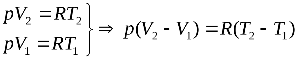 Запишем уравнения Клапейрона-Менделеева для двух состояний газа с учетом того, что ν = 1моль и вычтем из второго первое