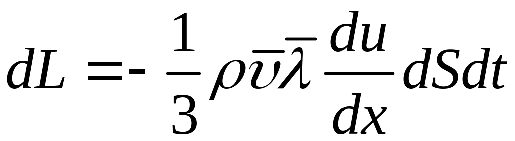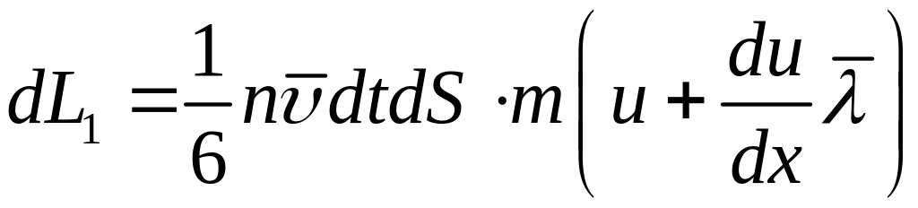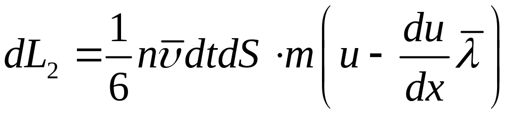 За это же время из площадки dS слоя, скорость которого равна u, вылетит такое же количество молекул и вправо и влево. Но так как скорости этих молекул одинаковые, равные u и направлены в разные стороны изменение импульса слоя при этом будет равно нулю. С учетом этого импульс, который перенесется через площадку dS в положительном направлении оси x, равен: