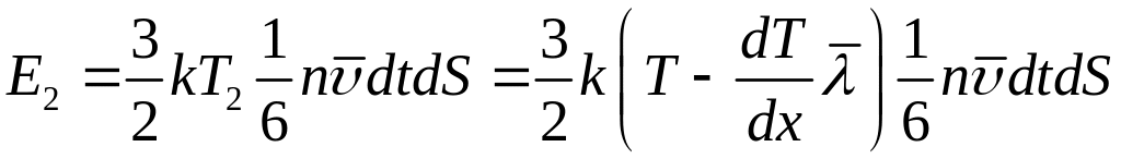 Через площадку dS проходят молекулы как слева направо, так и справа налево и если давление газа везде одинаково, то число молекул, которые проходят через площадку слева и справа за время dt очевидно одинаково. Однако молекулы, которые проходят слева движутся из области с более высокой температурой, чем те, которые проходят через площадку справа.