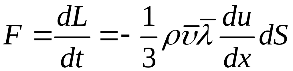 Градиент скорости вдоль оси x равен du/dx. Выберем площадку dS в слое со скоростью u. На расстояниях от нее слева и справа скорости слоев газа будут соответственно равны: