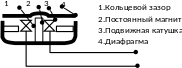 Электродинамический катушечный микрофон, работает следующим образом. В кольцевом зазоре 1 магнитной системы, имеющей постоянный магнит 2, находится подвижная катушка 3, скрепленная с диафрагмой 4. Воздействие звуковых волн приводит к колебаниям диафрагмы. Вследствие изменения напряженности магнитного поля относительно витков катушки возникает электромагнитная индукция. На выводах катушки возникает электрический сигнал. Процесс преобразования звука такой конструкцией так же обратим, возможно использование в качестве формирователя звука.