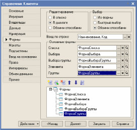 Наприклад, довідник Клієнти може мати декілька форм (рисунок 3.1), які використовуватимуться для певної мети, - редагування елементу довідника, відображення списку і так далі. Разом з цим, можуть існувати загальні форми, що не належать конкретним об'єктам прикладного рішення: