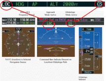 При выборе LOC в качестве навигационного источника, может быть произведен захват сигналов курсового и глиссадного маяков. По достижению глиссады, командный прибор переходит в режим захвата глиссады Glideslope Mode с сопровождением ВС по глиссаде.