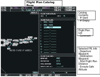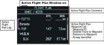 Активный план полета отображается на Active Flight Plan Page на MFD и на Active Flight Plan Window на PFD. Этот план полета является планом полета, который сопровождается системой G1000 и отображается на навигационной карте MFD. Сохраненные планы полета отображаются на странице Flight Plan Catalog Page на MFD и всегда готовы к активации пилотом.