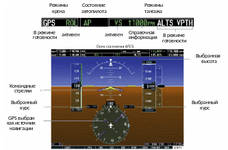 Сигнализация режимов работы командного прибора (Flight Director Mode) отображается на PFD, когда выбран режим активации командного прибора.