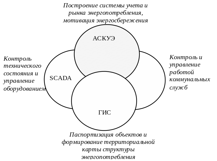 Например, в рамках ГЦП «Электронная Москва» разработана АСУ ЕИРЦ (ЕИРЦ – единый информационно-расчетный центр). Система предусматривает на первом (районном) уровне сбор измерительной информации с помощью первичных измерительных систем (ПИС), передачу ее на верхние уровни, где производится коррекция, анализ и распределение информации о потребленных энергоресурсах между подсистемами городского, окружного и районного уровней. В г. Самаре разработана АИС ТЭБ (ТЭБ – топливно-энергетический баланс), основными задачами которой являются обеспечение энергоэффективности объектов муниципальной собственности в рамках Самарской области [21].