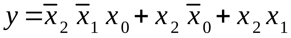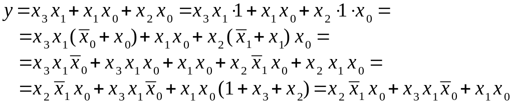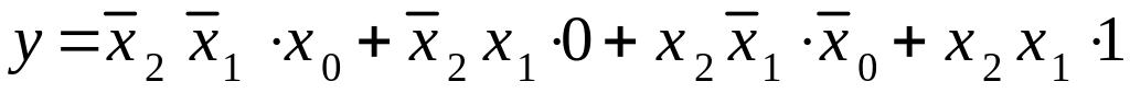 Используя правило развертывания, законы дополнительности, одинарных элементов, поглощения и распределительный закон первого рода, преобразовать МДНФ к виду, когда в выражении для реализуемой ФАЛ присутствуют все четыре конституенты единицы двух переменных, выявленных на предыдущей процедуре. В нашем случае имеем: