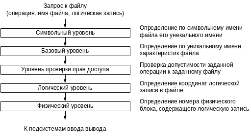 Функционирование любой файловой системы можно представить многоуровневой моделью, в которой каждый уровень предоставляет некоторый интерфейс (набор функций) вышележащему уровню, а сам, в свою очередь, для выполнения своей работы использует интерфейс (обращается с набором запросов) нижележащего уровня.