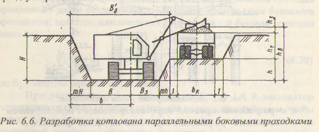 При устройстве котлованов число проходок и их параметры устанавливают расчетом с обеспечением наименьших затрат времени на выполнение рабочего цикла экскавации.