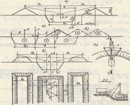 Схемы движения экскаватора, размеры отвалов, а также способы выгрузки грунта в отвал или на транспортные средства определяется в зависимости от габаритов разрабатываемой выемки (рис. 6.9,а).