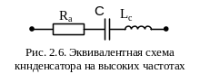 Частотные свойства емкости определяются конструктивными особенностями исполнения. При увеличении частоты переменного напряжения изменяется диэлектрическая проницаемость диэлектрика, сильнее проявляются паразитные (собственные) индуктивность и емкость конденсатора, возрастает сопротивление потерь. На высоких частотах эквивалентом конденсатора может служить последовательный колебательный контур, составленный из емкости конденсатора (включает паразитную емкость), собственную индуктивность и сопротивление потерь, рис.2.6. .