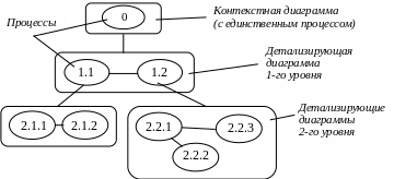 В частности, DFD первого уровня строится как декомпозиция процесса контекстной диаграммы. Диаграмма первого уровня имеет множество процессов с номерами, которые используются при дальнейшей декомпозиции. Процесс первого уровня декомпозиции содержит процессы 1.1, 1.2, 1.3, ... . При переходе на следующий уровень добавляется индекс - 2.1.1, 2.1.2, ... и т.д. (см. рисунок 3.3).