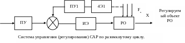 Возмущение воздействия F1 …n меняет выходную величину х. Они измеряются, полученный сигнал усиливается ПУ1, подаётся после преобразования на ИЭ, которое осуществляет управляющее воздействие fx на регулируемый объект (РО).