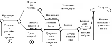 Сетевые методы основаны на наглядном представлении выполняемого комплекса работ в виде ориентированного графа (сети). Граф должен быть конечным, не содержащим циклов (контуров). Вершины изображают события, означающие окончание выполнения операции, например, проектирование закончено, фундамент построен, бетон залит, сборка завершена и т.д. Дуги (рёбра) графа – изображают отдельные этапы общей программы – работы: разработка задания на проектирование, оформление заказа на фундаментную плиту и т.д.