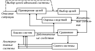 Выбор целей Холл считает одной из важнейших процедур проектирования. Цели должны соответствовать системе ценностей, принятой для проектируемой системы. Однако ряд элементов системы ценностей оказывается общим для всех систем (прибыль, рынок, стоимость, качество, технические характеристики, совместимость с существующими системами, стойкость против морального старения, простоту и изящество, безопасность в обслуживании, время на разработку). В качестве методов синтеза систем Холл предлагает мобилизацию идей и функциональное проектирование. Первое означает сбор всех известных альтернатив и выработку новых (без поспешной критики). Всегда должна быть более чем одна альтернатива решения задачи. Функциональное проектирование представляет наиболее общий подход к описанию систем. Определяются граничные условия, желательные входы и выходы, составляется подробный перечень функций или операций, которые должны выполняться. Метод в упрощенном виде сводится к составлению блок-схемы системы. Процедура анализа системы состоит в выделении всех возможных следствий из альтернативных систем для выбора из них наилучшей. При анализе некоторые сведения получаются объективно (путем сбора опытных данных и нахождения распределения частот), другие субъективно - путем интуитивного восприятия относительных частот, неявно отображающих объективные частоты. Для выбора оптимальной системы в условиях определенности, когда все следствия определены по шкале отношений, можно воспользоваться аппаратом математического программирования. Дело осложняется, когда следствия недостоверны, взаимозависимы и требуют различных шкал измерений.