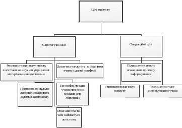 Стратегічною ціллю проекту є інформування учнів старших класів про науку «логістика», спеціальність «логістик», нинішній стан та важливість даної професії, її сучасний розвиток в Україні. Дерево цілей даного проекту представлено на рис. 1