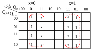 Розглянемо роботу такого регістра, який повинний виконувати операції збереження інформації, зсувом числа 15(1111) ліворуч на 3 розряди та праворуч на 1 розряд. Побудуємо таблицю яка описує роботу такого регістра. Приймемо якщо сигнал Х на виконання операції рівний – «0» , то відбувається зсув ліворуч на три розряда і «1» праворуч на 1 розряд. Побудувавши таблицю проведемо мінімізацію і знайдемо функцією збудження тригерів. Синтез проведемо на JK – тригерах, тоді будемо мати.