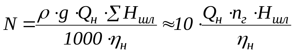 На двухсклонном судоходном канале насосные станции включаются в состав сооружений гидроузлов (шлюзов) только одного из его склонов (как правило там, где высота подъема воды до отметки водораздельного бьефа оказывается меньше). Для определения полной высоты подъема воды необходимо знать величину напора на шлюзах этого склона канала (в данной практической работе Ншл) и их количество (nн). С целью унификации оборудования обычно стремятся обеспечить одинаковый расход насосных станций и напор на гидроузлах судоходного канала. Необходимая мощность насосных станций определяется по формуле: