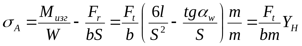 Напряжения сжатия вычитаются из напряжений изгиба. Учитывая, что напряжения изгиба в консольной балке равны частному от деления изгибающего момента Mизг на момент сопротивления корневого сечения зуба W, а напряжения сжатия это сила Fr, делённая на площадь корневого сечения зуба, получаем: