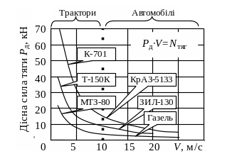 ▪ трактор − при малих (до 10 м/с) швидкостях і великих силах тяги;