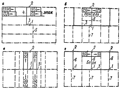Деление шахтного поля на части: 1 — воздухоподающий ствол; 2 — вентиляционный ствол; 3 — главный откаточный штрек; 4 — бремсберг с ходком; 5 — капитальный уклон с ходком; о — панельный бремсберг с ходками; 7 —панельный уклон с ходками