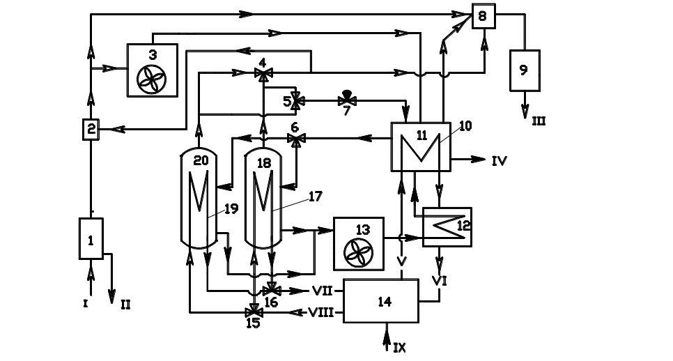 Наприклад, продукція газової (газоконденсатної) свердловини (потік І) при температурі 25 оС і тиску 0,8 МПа, поступає в сепаратор 1, де відділяється від механічних домішок, конденсату води та вуглеводнів (потік ІІ) і направляється в ежектор попереднього стиснення 2 де він стискується до тиску гідратоутворення (Рг = 2,5 МПа) газом високого тиску, який утворюється при плавленні газогідратів почергово в газогідратних дотискувачах 18 або 20 при тискові 12 – 16 МПа. Після ежектора попереднього стиснення 2 від газового потоку відбирається частина газу і після охолодження в апараті повітряного охолодження 3 надходить до реактора утворення газогідратів 11 в якому він при контакті з водою, що також після охолодження надходить до нього, утворює газогідрат при тиску Рг = 2,5 МПа і середній температурі 3 оС. Відвід теплоти гідратоутворення із реактора утворення газогідратів 11 (потоки V і VI) відбувається завдяки розміщеному в ньому випарнику 10 холодильної машини 14. Частина відібраного газу, що не увійшла у склад газогідрату повертається через ежектор остаточного стиснення 8 в основний газовий потік. Вуглеводневий конденсат, що утворюється в реакторі гідратоутворення в результаті попереднього стискування і охолодження гідртоутворюючого газу виводиться у вигляді потоку IV. Утворений газогідрат через трьохходовий кран 6 почергово надходить в газогідратні дотискувачі 18 і 20 (до максимальної їх загрузки) і внаслідок почергового підключення через трьохходові крани 15 і 16 в роботу конденсаторів холодильної машини 17 і 19 (потоки VII і VIII), розміщених в газогідратних дотискувачах 18 і 20, плавиться в обмеженому просторі при тиску 12 - 16 МПа і температурі 25 - 28 оС з утворенням потоку газу високого тиску та води. Вода після закінчення стадії плавлення газогідрату із газогідратних дотискувачів 18 і 20 після охолодження в апараті повітряного охолодження 13 і в теплообміннику 12 до темпратури 1–2 оС надходить в реактор утворення газогідратів 11, причому цей процес відбувається шляхом поступового заміщення (витіснення) води в газогідратному дотискувачі 18 чи 20 утвореним газогідратом в міру його надходження із реактора утворення газогідратів 11. Потік газу високого тиску, що утворюється в результаті почергового плавлення газогідратів в газогідратних дотискувачах 18 чи 20 (переключення відбувається трьохходовим краном 4) розділяють на дві частини, однією з яких здійснюють ежектування потоку газу в ежекторі попереднього стиснення 2, а іншою ежектують і стискують другий потік газу в ежекторі остаточного стиснення 8 до тиску Рн = 6,0 МПа, необхідного для його підготовки і подачі в газопровід, причому в кінці стадії плавлення газогідрату, коли тиск виділеного газу стає нижчим за необхідний для ефективної роботи ежекторів попереднього 2 і остаточного 8 стиснення цей потік направляється на повторне гідратоутворення в реактор гідратоутворення 11 через трьохходовий кран 5 і дросель 7. Стиснений газ після ежектора остаточного стиснення 8 надходить в блок осушки стиснутого газу 9, а з нього в трубопровід (потік ІІІ ). для роботи пароежекторної пропанової холодильної машини 14 може бути використано практично будь-яке джерело теплової енергії (потік ІХ).